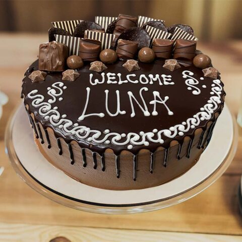 This round chocoltae drizzle cake is one of our popular designs with four layers of vanilla sponge & chocolate fresh cream, lavishly decorated with chocolate toppings and chocolate drizzle on the sides.