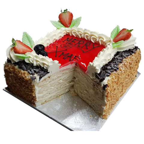 This square cake is one of our popular designs with four layers of vanilla sponge & fresh cream, lavishly decorated with tropical fruit on top with the sides coated with choice of chocolate or nut sprinkles.
