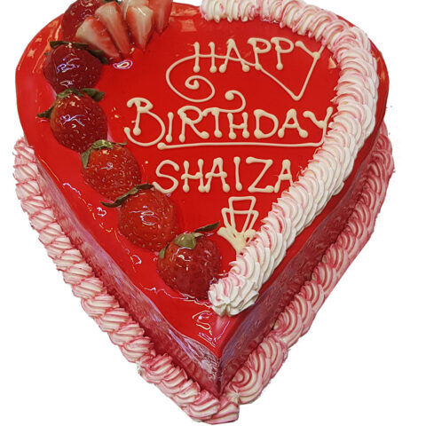 This Red Heart shape cake has four layers of vanilla sponge & fresh cream, decorated with minimal strawberries and strawberry glazing. All our cakes are generally filled with layers of rich silky fresh cream and complemented with the lightest vanilla sponge. All our cakes are suitable for vegetarians and are all lovingly and carefully created.Create your cake and choose from the options below