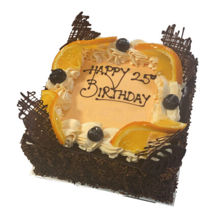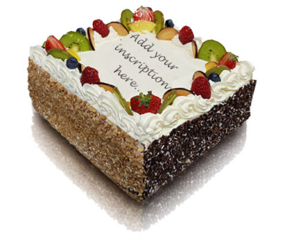 This square cake is one of our popular designs with four layers of vanilla sponge & fresh cream, lavishly decorated with tropical fruit on top with the sides coated with choice of chocolate or nut sprinkles.