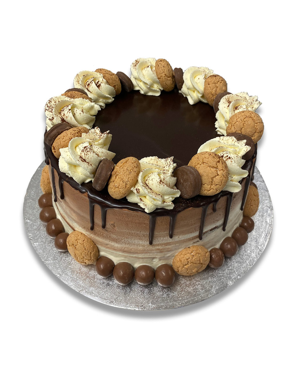 The top of the cake is stylishly decorated with amaretti biscuits together with thick a ganache chocolate drizzle.