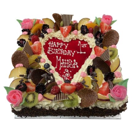This square cake is one of our chef special designs with Four layers of vanilla sponge & fresh cream. The cake is stylishly decorated with lots of extra glazed tropical fruit with a heart in the middle with strawberry jam finished off with decorative pieces of chocolate.