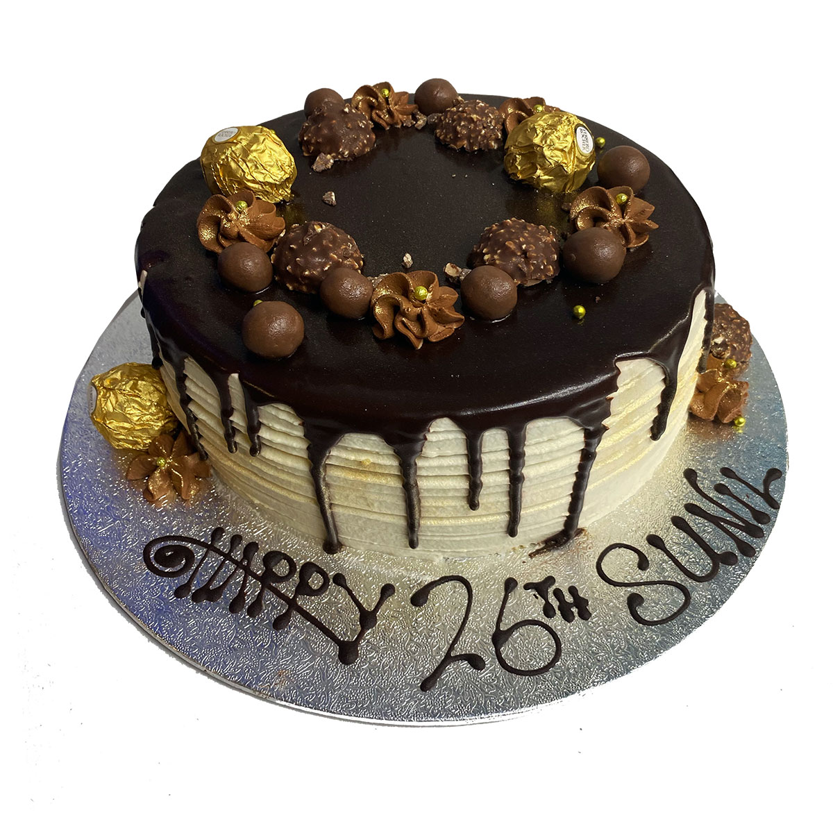 This round chocoltae drizzle cake is one of our popular designs with four layers of vanilla sponge & chocolate fresh cream, lavishly decorated with chocolate toppings and chocolate drizzle on the sides.