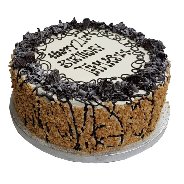 This round Nutty Professor Cake (square option available) has four layers of vanilla sponge & fresh cream on the top.