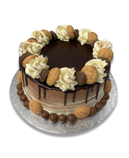 All our cakes are generally filled with layers of rich silky fresh cream and complemented with the lightest vanilla and chocolate sponge, finished off to the highest quality with the toppings of your choice. As you can appreciate all our cakes are individually hand crafted so there might be some slight differences to the image shown.