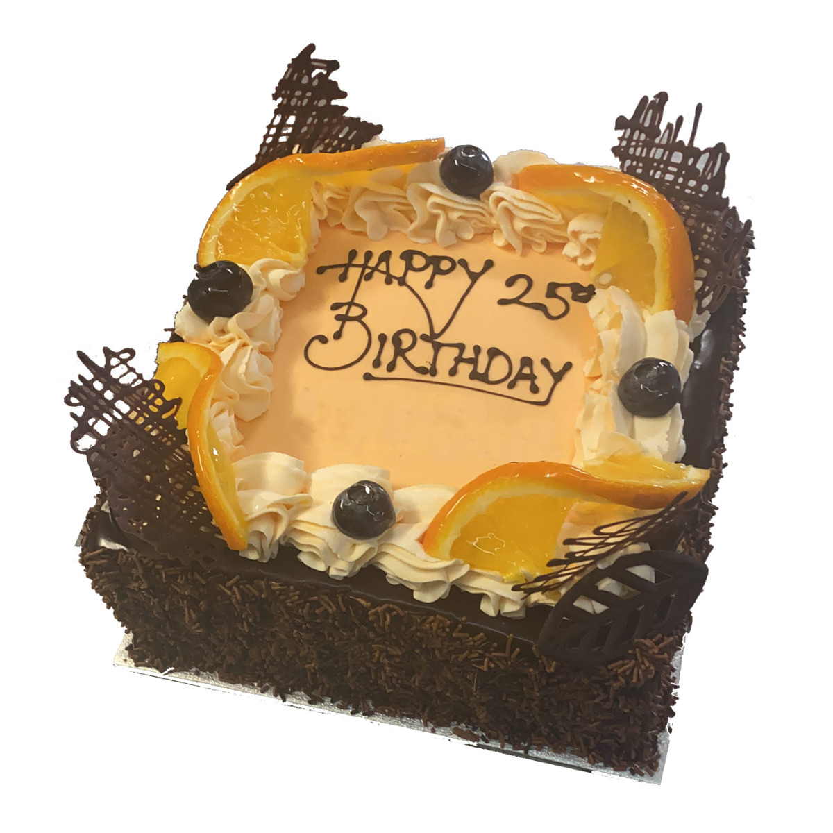 Topped with fresh orange slices and decorated with chocolate